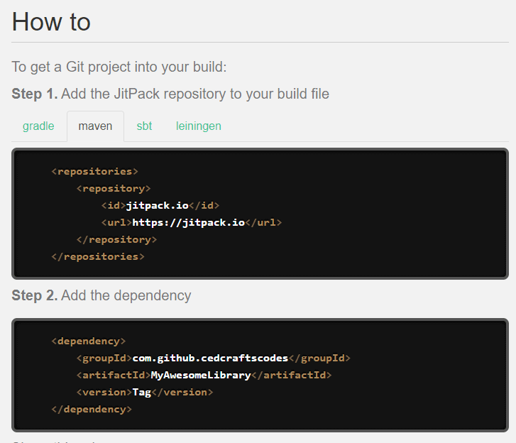 1 2 3 4 5 6 7 8 9 10 11 12 | <dependency> <groupId>com.github.cedcraftscodes</groupId> <artifactId>MyAwesomeLibrary</artifactId> <version>c67992f720</version> </dependency> <repositories> <repository> <id>jitpack.io</id> <url>https://jitpack.io</url> </repository> </repositories> |